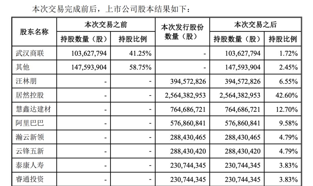 交易完成后,居然控股持有上市公司42.60%股份,跻身为公司控股股东。值得一提的是,由于居然之家创始人汪林朋直接或间接持有居然控股93.75%的股份,为居然控股实际控制人。