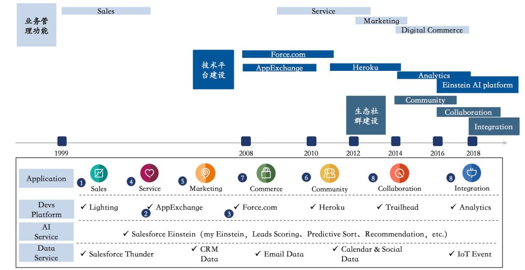 Salesforce产品发展主要从 业务管理功能 、 技术平台建设 和 生态社群建设 三个方面进行。
