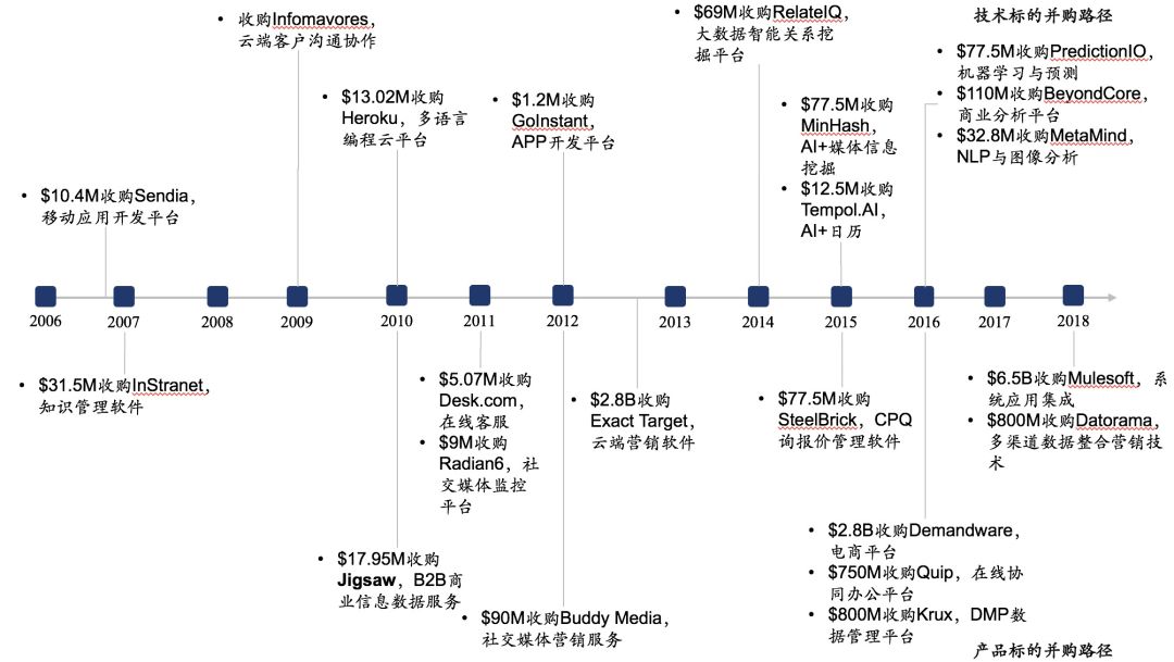 Salesforce产品体系发展主要来自并购整合,从技术标的和产品功能标的两方面入手,不断构筑产品生态壁垒: