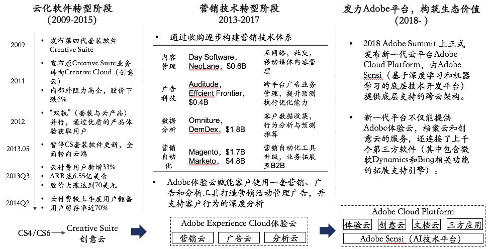 Adobe转型之路可以分为三个阶段: 云化转型阶段、营销技术增值阶段和平台生态建设阶段 。
