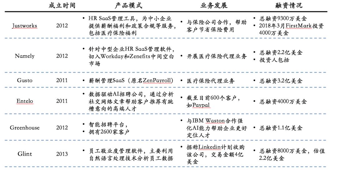 另外,HR SaaS产品天然包含员工信息和员工行为,有机会做C端相关服务转化,如美国Zenefits通过免费产品快速切入,然后通过企业员工商保销售来赚钱,近年来崛起的Namely,Justworks,Gusto等也遵循同样的逻辑。