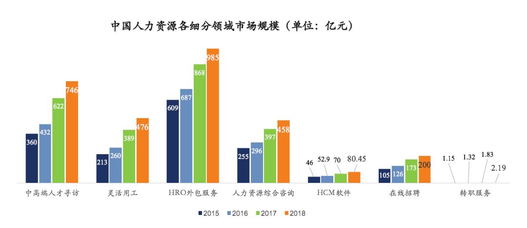 中国人力资源服务市场巨大,2018年约2400多亿,其中大头集中在高端人才寻访、HR人力外包领域。