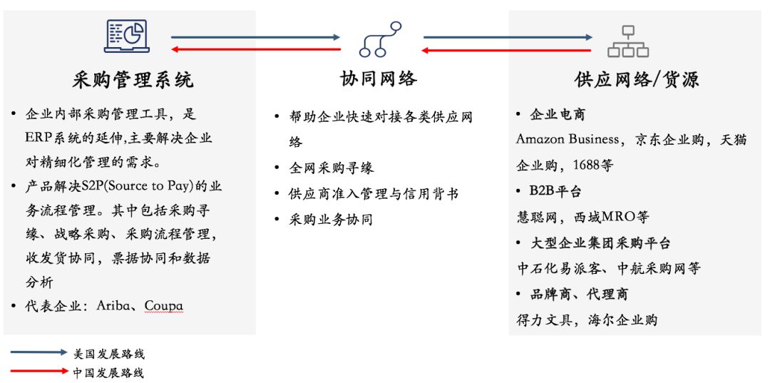 美国采购供应链以采购管理系统为核心向供应网络发展而中国因电商的发达在供应网络端整合程度深,所以会反向带动协同网络与采购管理系统提升。