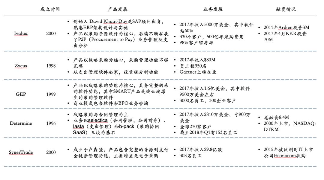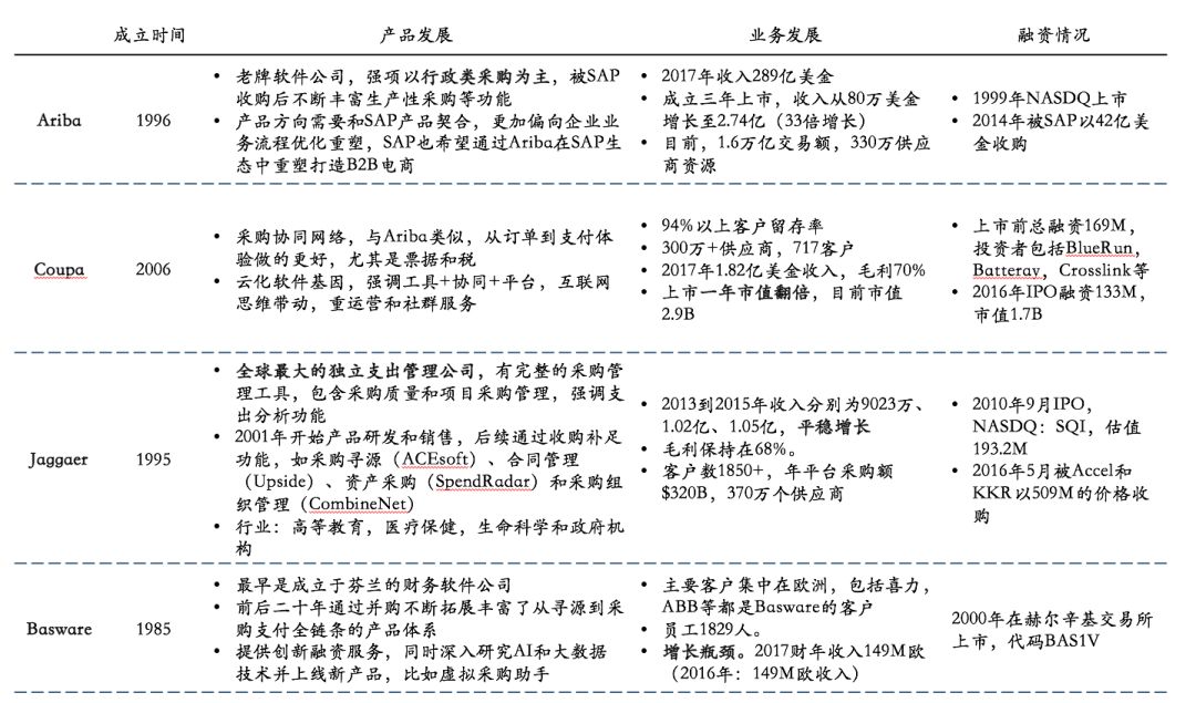 Ariba规模一家独大,Coupa发展迅速,其他老牌厂商规模相当,增长缓慢。