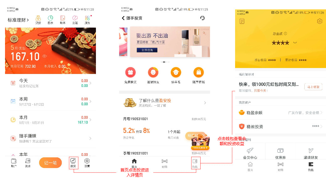 首页>点击“投资”按钮>进入投资选择产品详情页>点击"钱包"查看个人收益和余额详情: