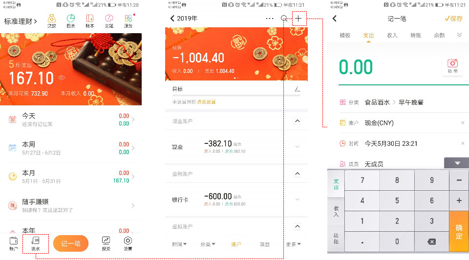 同时,为更加丰富用户在不同使用场景下也需要用到记账功能,“账户”,“流水”以及“设置”Tab都可找到进入记账功能的操作路径。