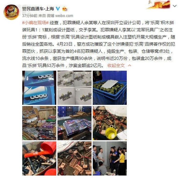 上海警方今日介绍了侦破的全国首例侵犯“乐高”玩具品牌著作权案。抓获以李某为首的4名犯罪嫌疑人,捣毁生产、包装、仓储等窝点3处,流水线10余条,缴获生产模具90余块,说明书近20万份,包装盒20万余件,成品“乐拼”玩具63万余件,涉案金额逾2亿元。