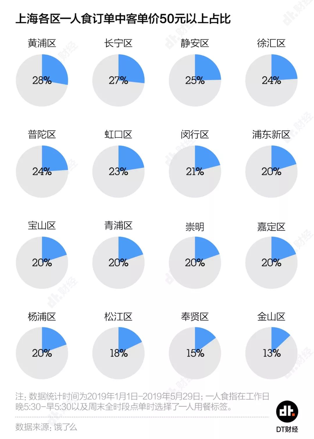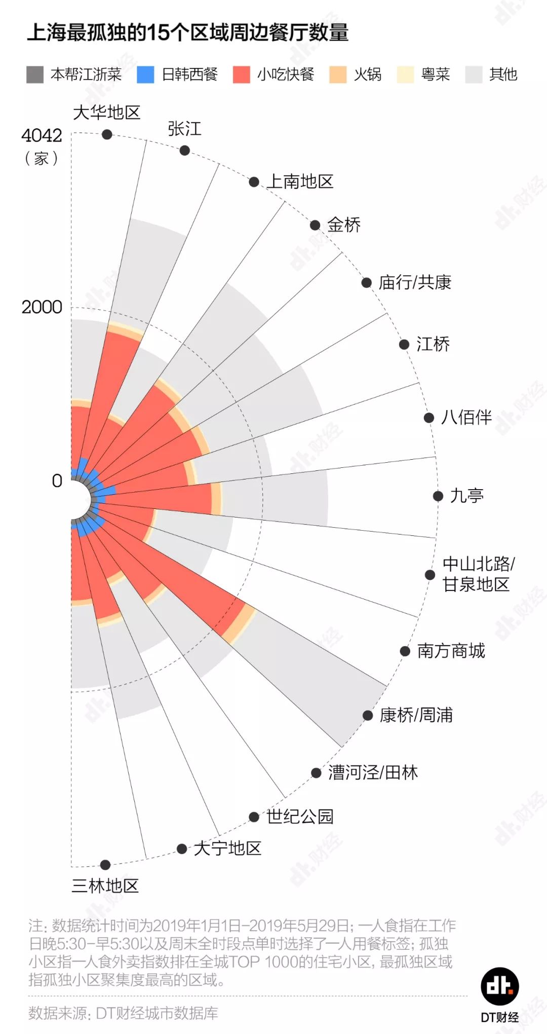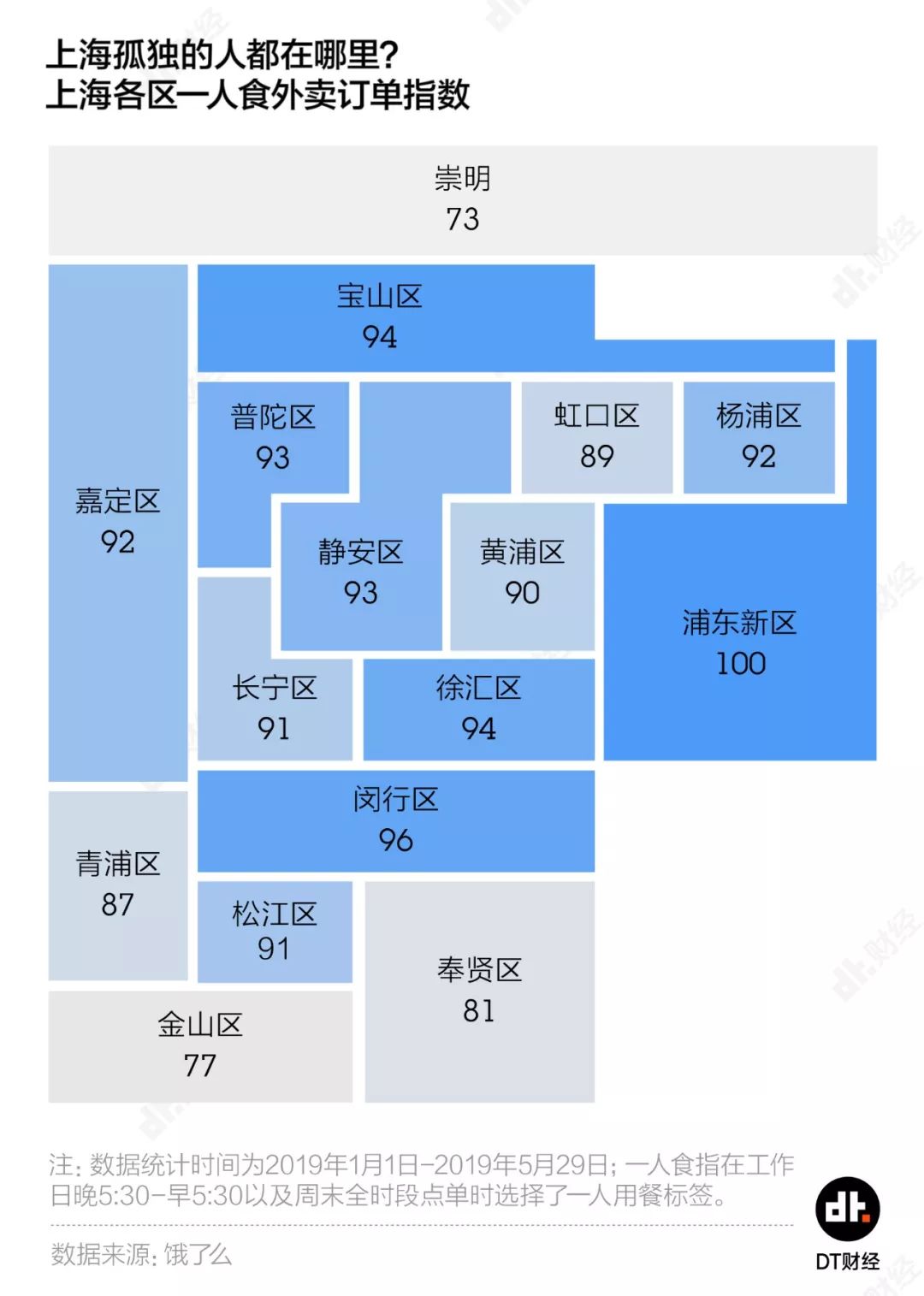 于是,DT君(公众号ID:DTcaijing)与 饿了么 联合展开了一个小研究,通过比较各住宅小区在上述孤独时段的一人食外卖订单指数,看看上海哪些区域的小伙伴最孤独?各个区域的孤独又有何不同?