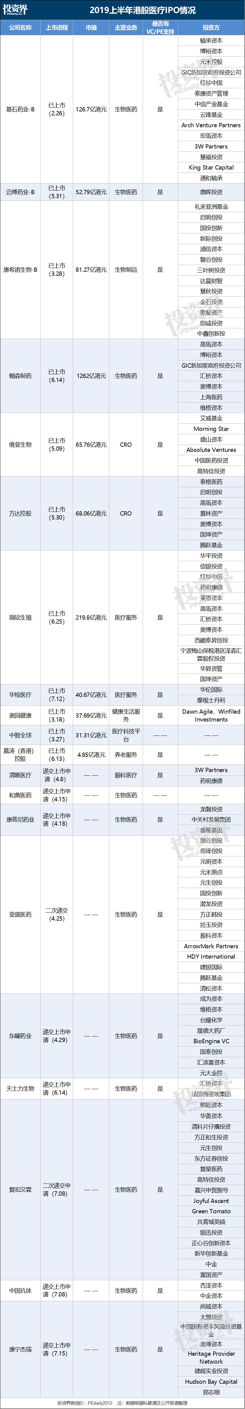 据投资界不完全统计,2019年上半年仅在港交所递交上市申请的医疗行业企业就有20家,涉及生物制药、CRO、辅助生殖服务、养老服务等领域,有14家来自生物医药这一细分赛道。截止目前,已有11家企业已完成IPO,平均每月2家IPO。