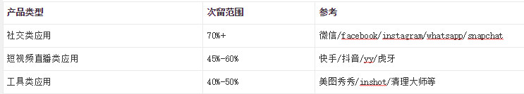 这里简单列举下主要产品形态的较为成功的新用户短期(次日)留存情况,可能会有误差,仅供参考。