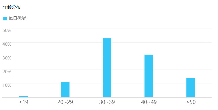 每日优鲜的用户比例中,女性的比例是要大幅度高于男性用户;用户的年龄结构也是偏向于年轻化。