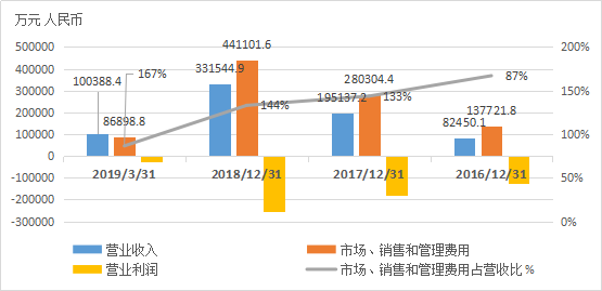 从2016年到2019年第一季度,优信年度营业收入虽呈现上升趋势,但始终未能盈利,且市场推广费用连续3个财年超过营收规模。2018年,优信市场推广和管理费用高达44.11亿元。2019年第一季度虽略有好转,但市场推广费用也达到了总营收的近87%。