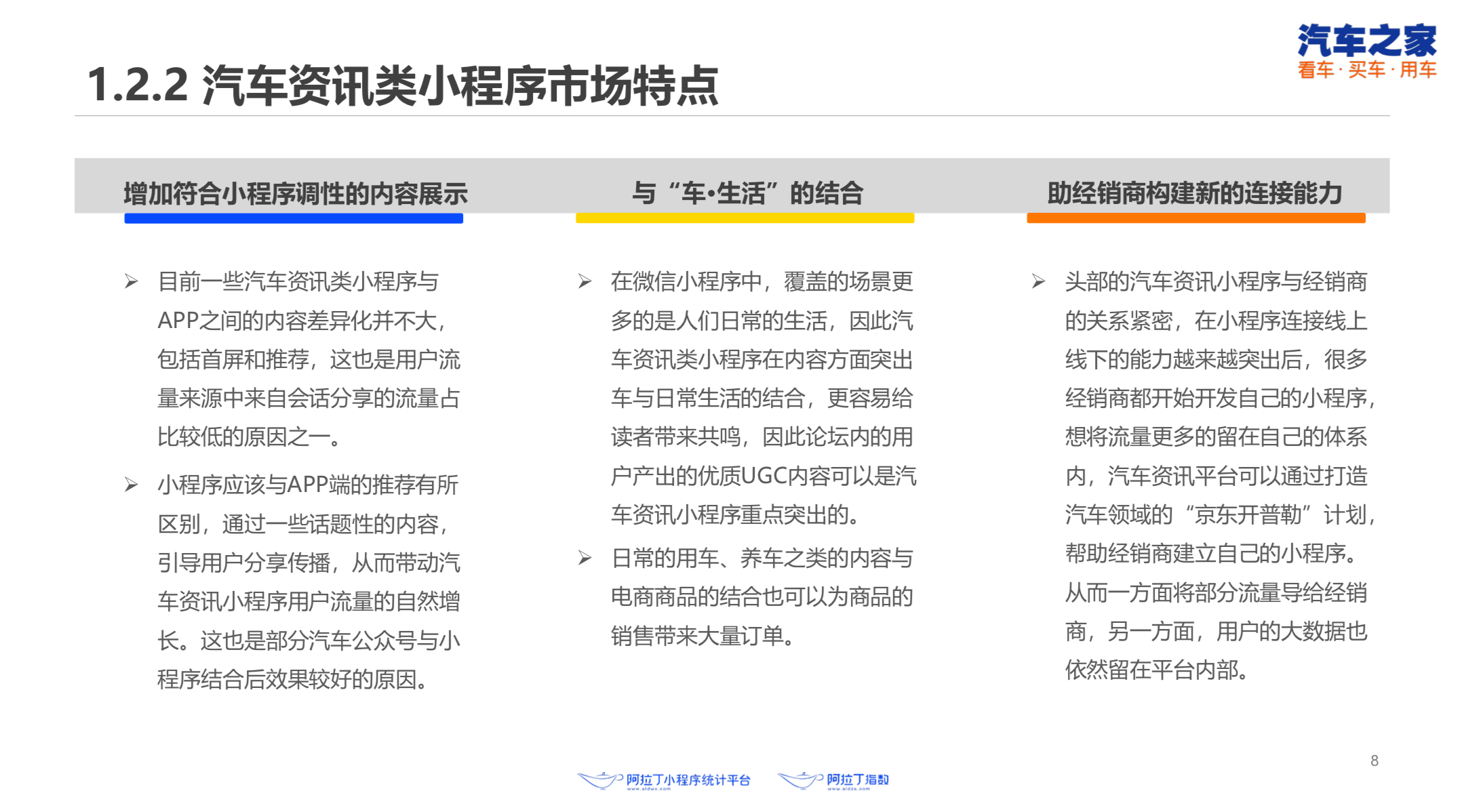 2.汽车厂商和4S店正在积极布局小程序,作为一种新的传播方式,各大厂商都在积极探索。小程序为线下直销店面导流效果显著,有效地促进了新车交易。汽车厂商的小程序页面以产品推荐为主,包括车型、配置和体验等内容。