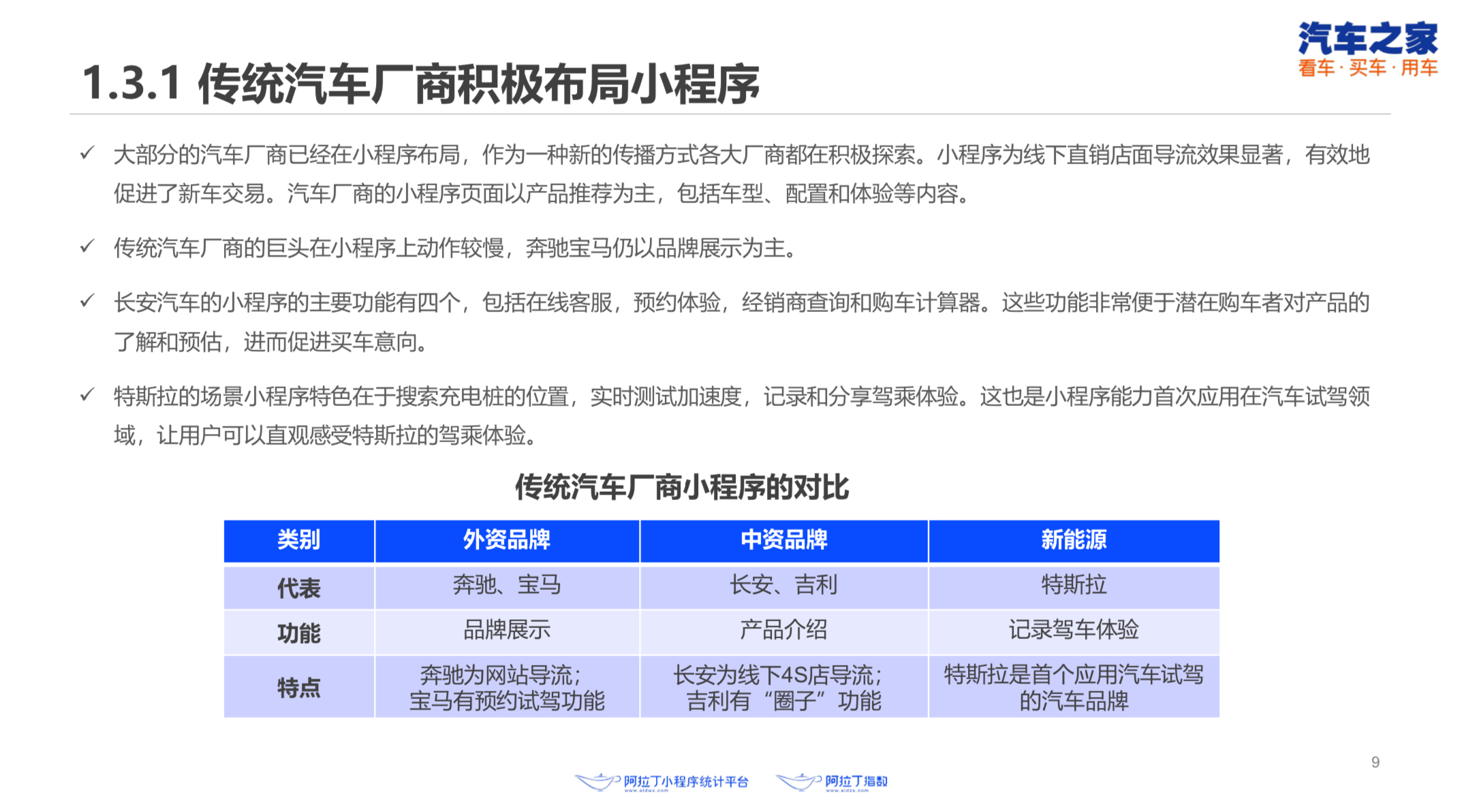 大部分汽车厂商已经在布局小程序。传统汽车厂商的巨头在小程序上动作较慢,奔驰、宝马仍以品牌展示为主。