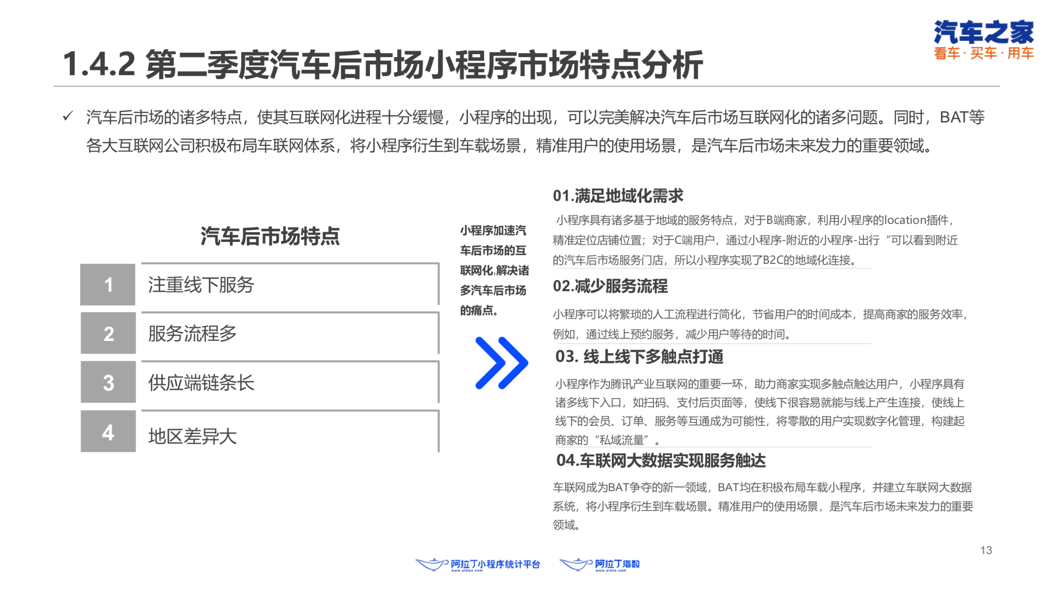 第二季度汽车后市场中小程序服务的特点:满足地域化需求、减少服务流程、打通线上线下触点、通过车联网大数据实现服务触达。