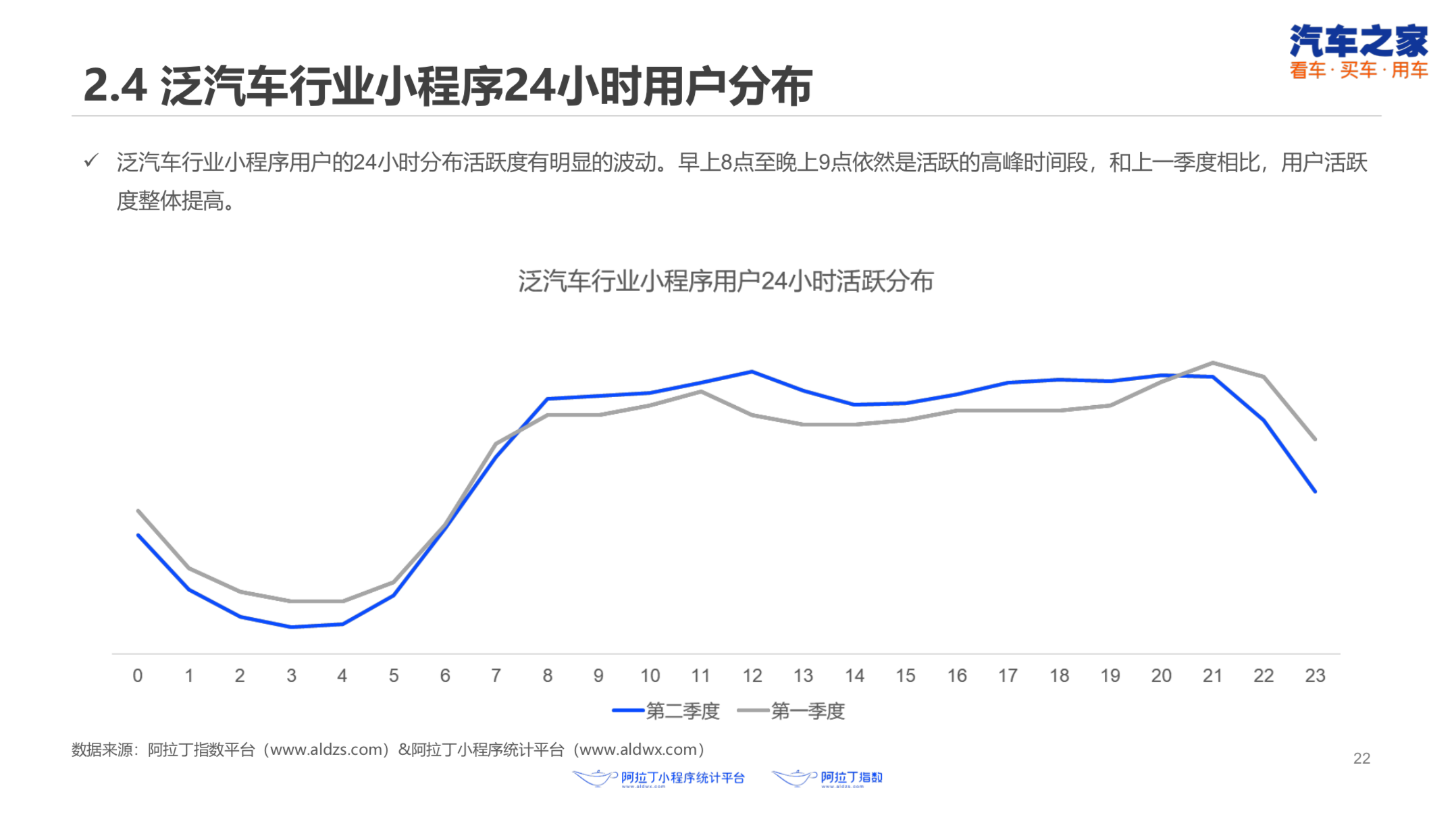 泛汽车行业小程序用户的24小时分布活跃度有明显的波动。早上8点至晚上9点依然是活跃的高峰时间段,和上一季度相比,用户活跃度整体提高。