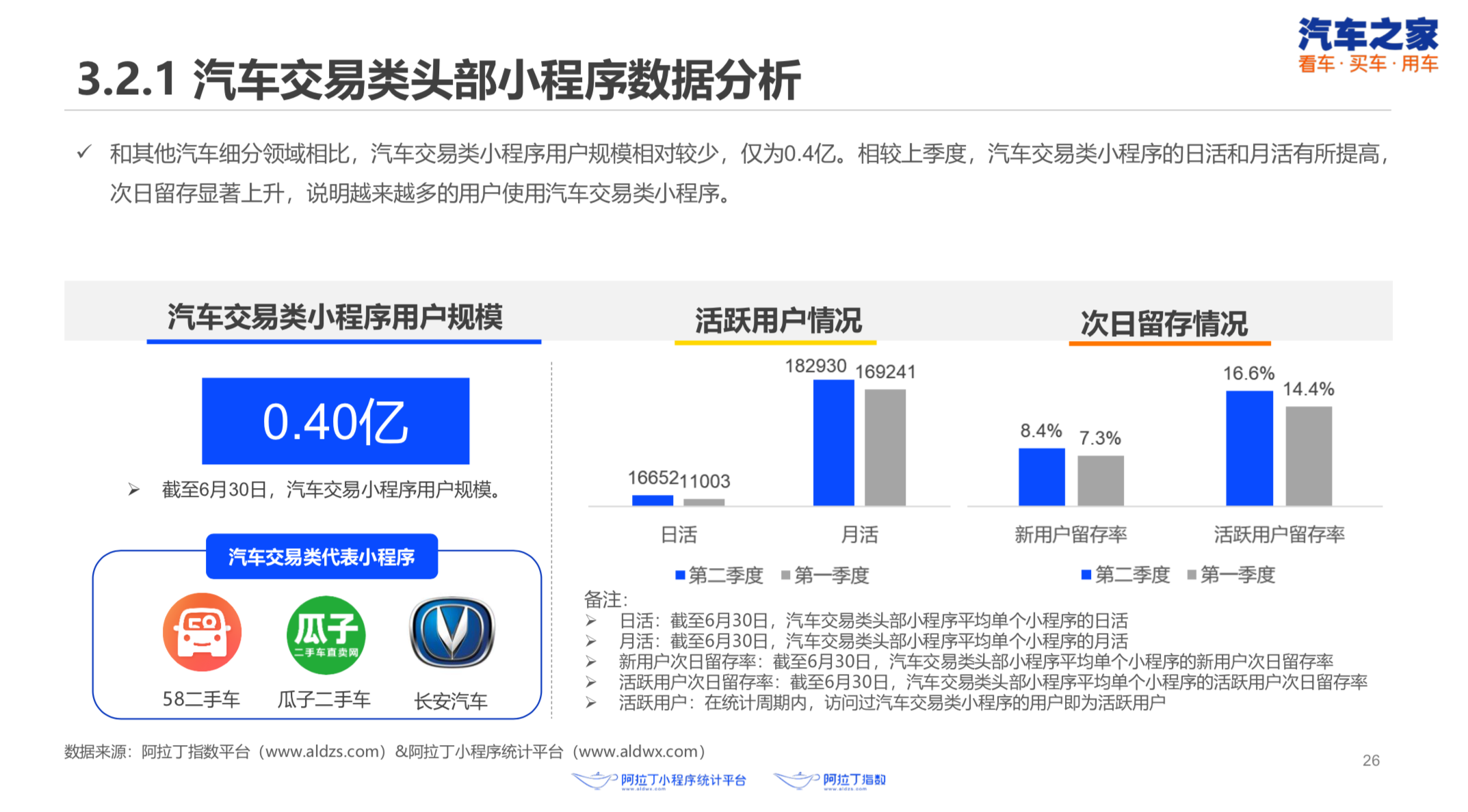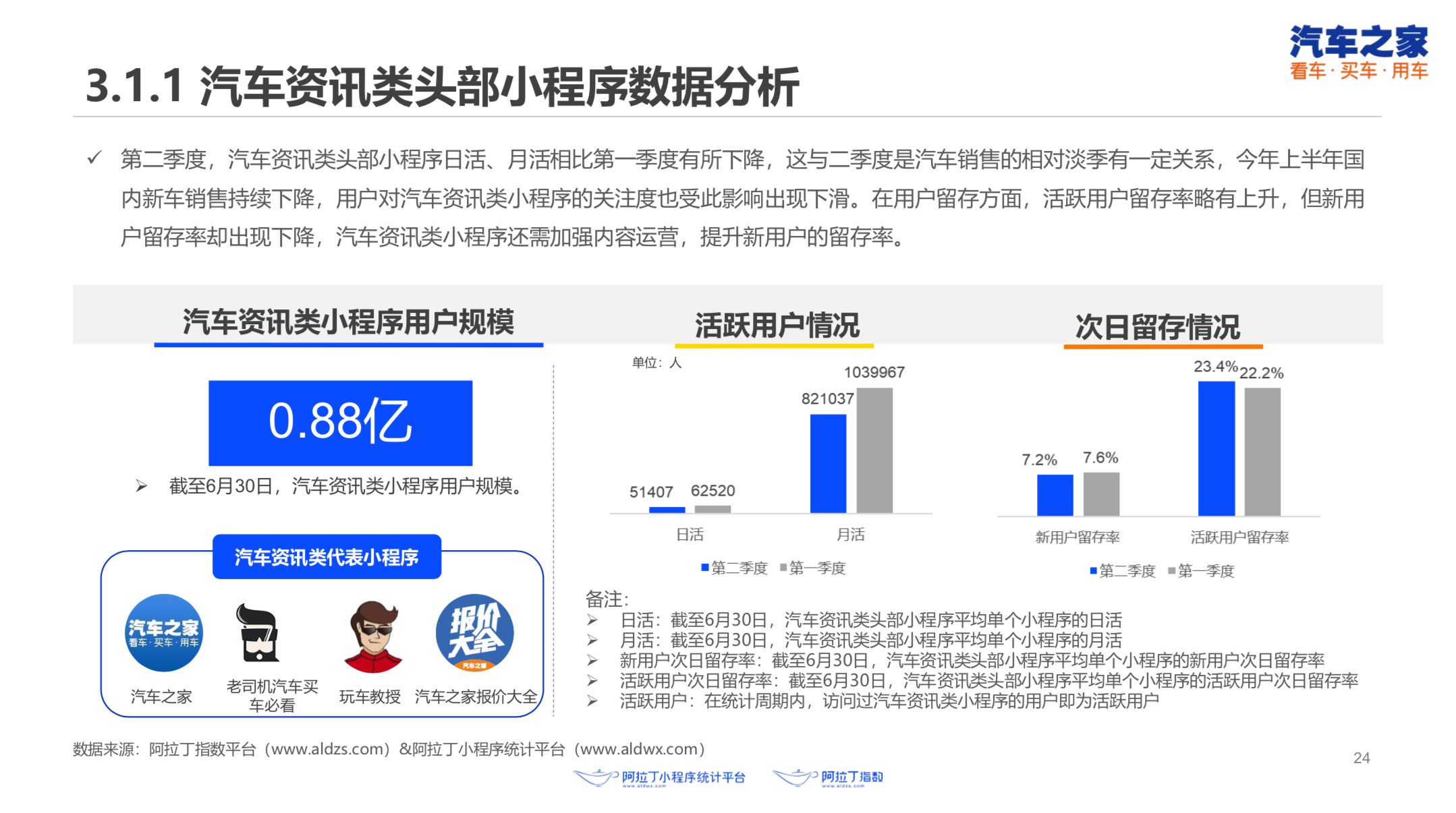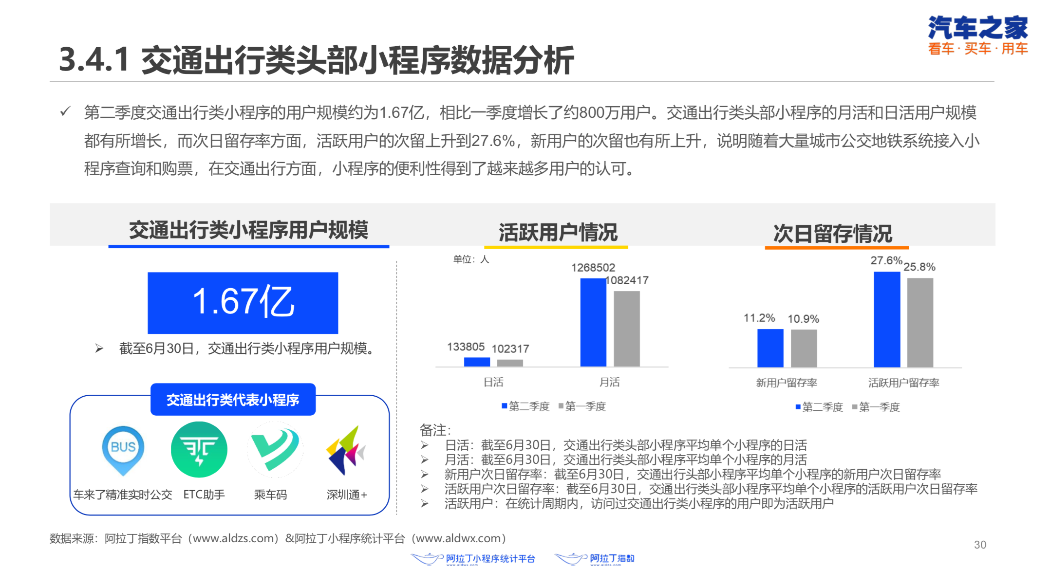 7月31日,汽车之家联合阿拉丁研究院发布了《2019第二季度泛汽车小程序研究报告》。报告对2019年Q2泛汽车行业小程序的运营、用户及数据情况进行了统计。