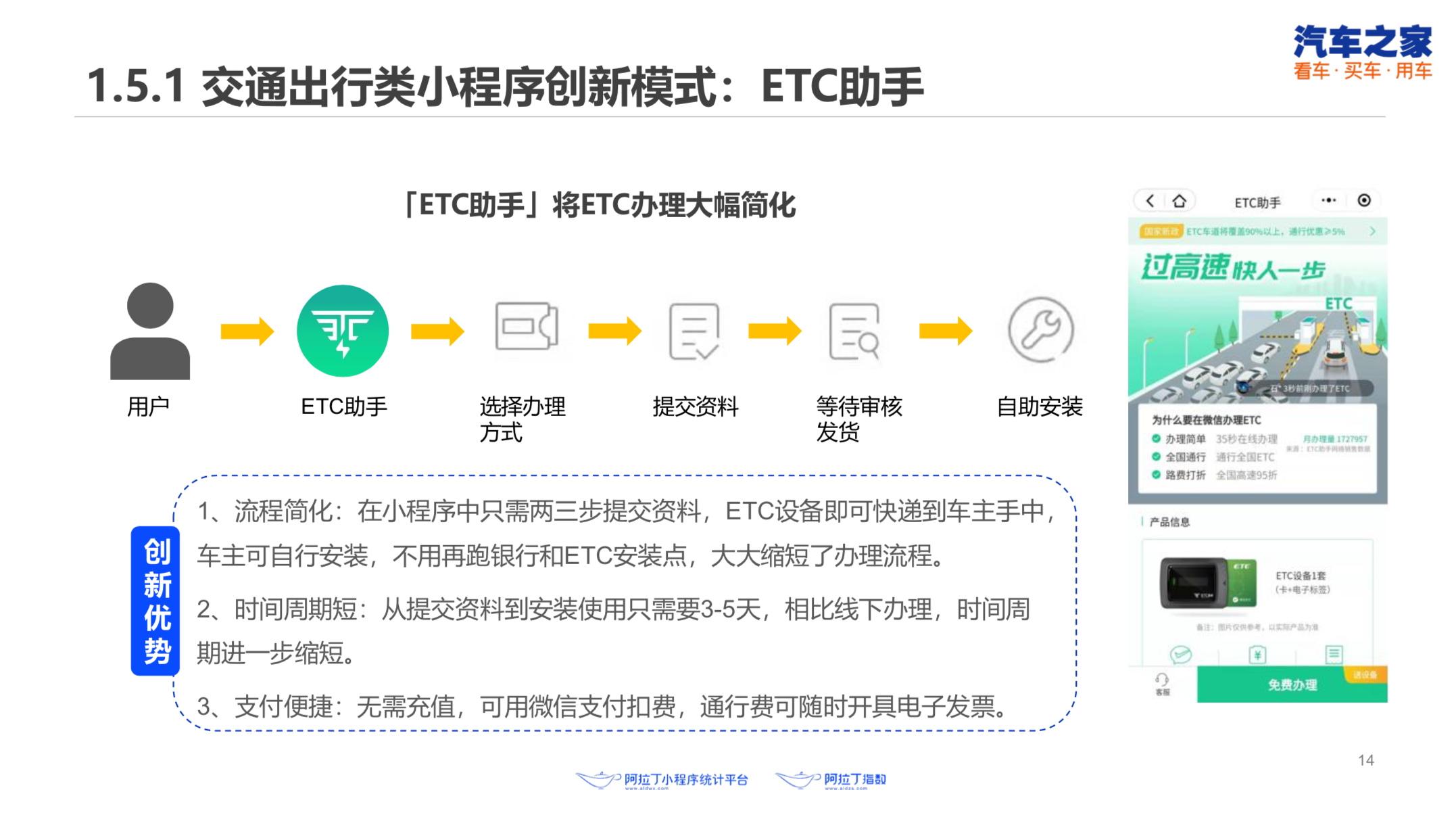 交通出行类小程序创新模式ETC助手,可以实现流程简化、办理周期缩短以及支付的便捷。