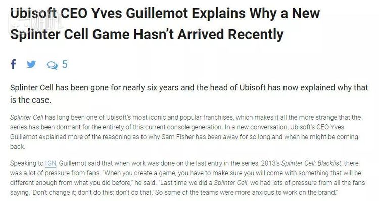 《细胞分裂》的续作为啥还没消息,育碧CEO给出了一些解释