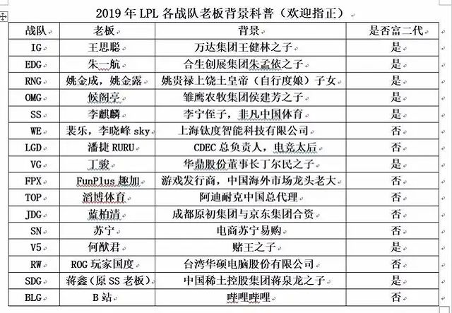 此前,业内流传一份2019LPL战队老板背景资料,每一位都来头不小。