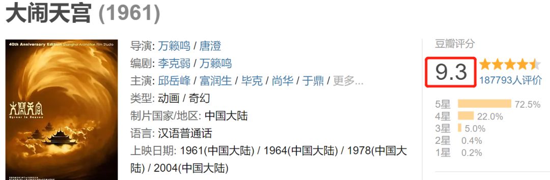 它在豆瓣的评分高达9.1,仅次于《大闹天宫》。 最近上映的哪吒是8.6