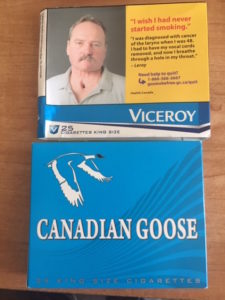 I asked him where he got it. He said that a woman in a bar sold it to him. Can you guess where it was sold originally? On a First Nations reserve in Canada. The federal government has less power there and so it can't legally require cigarette sellers on the reserve to carry those pictures or negative messages.