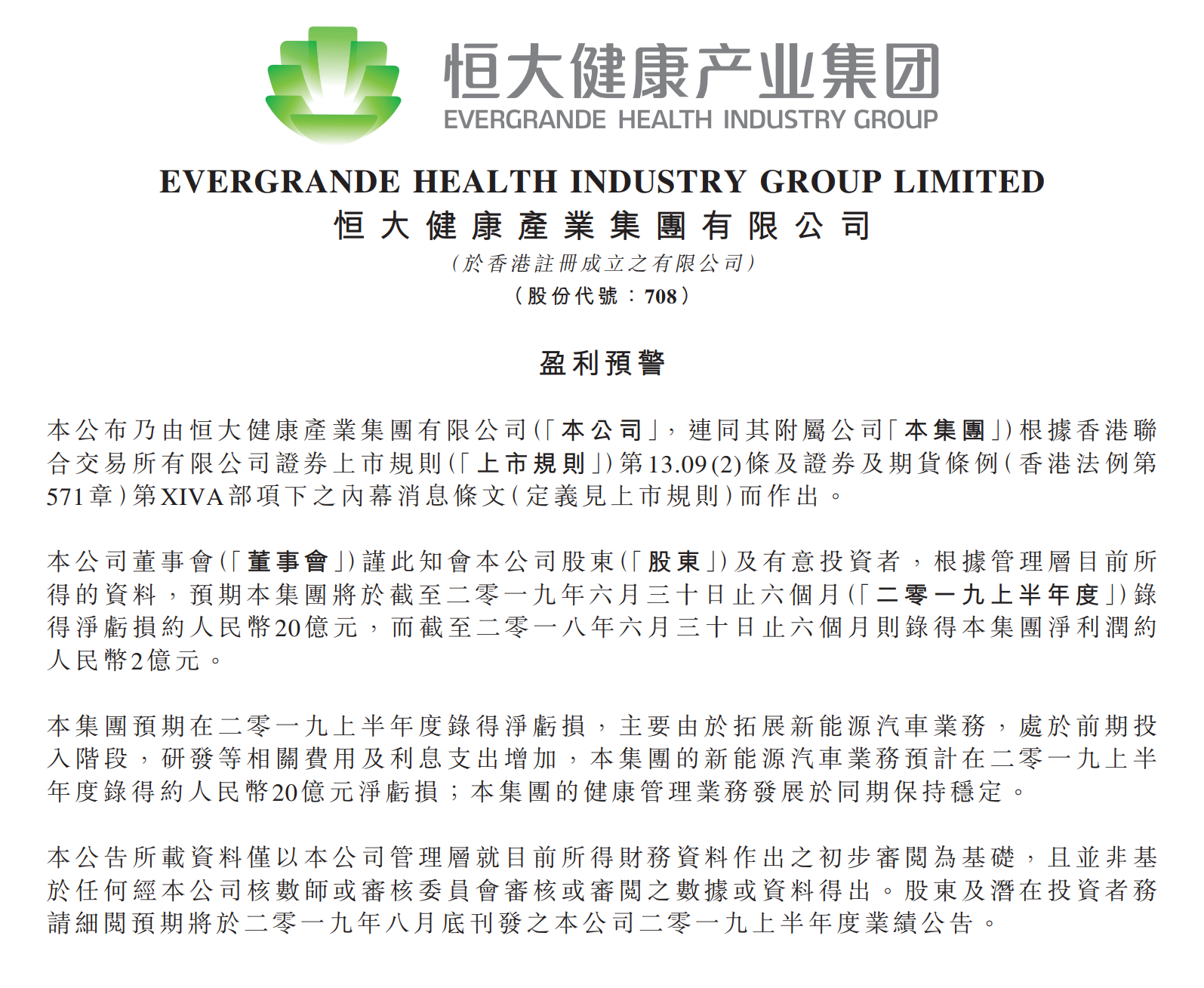 8月9日晚23点左右,在半年财报公布之前,恒大健康在港交所发布盈利预警公告。