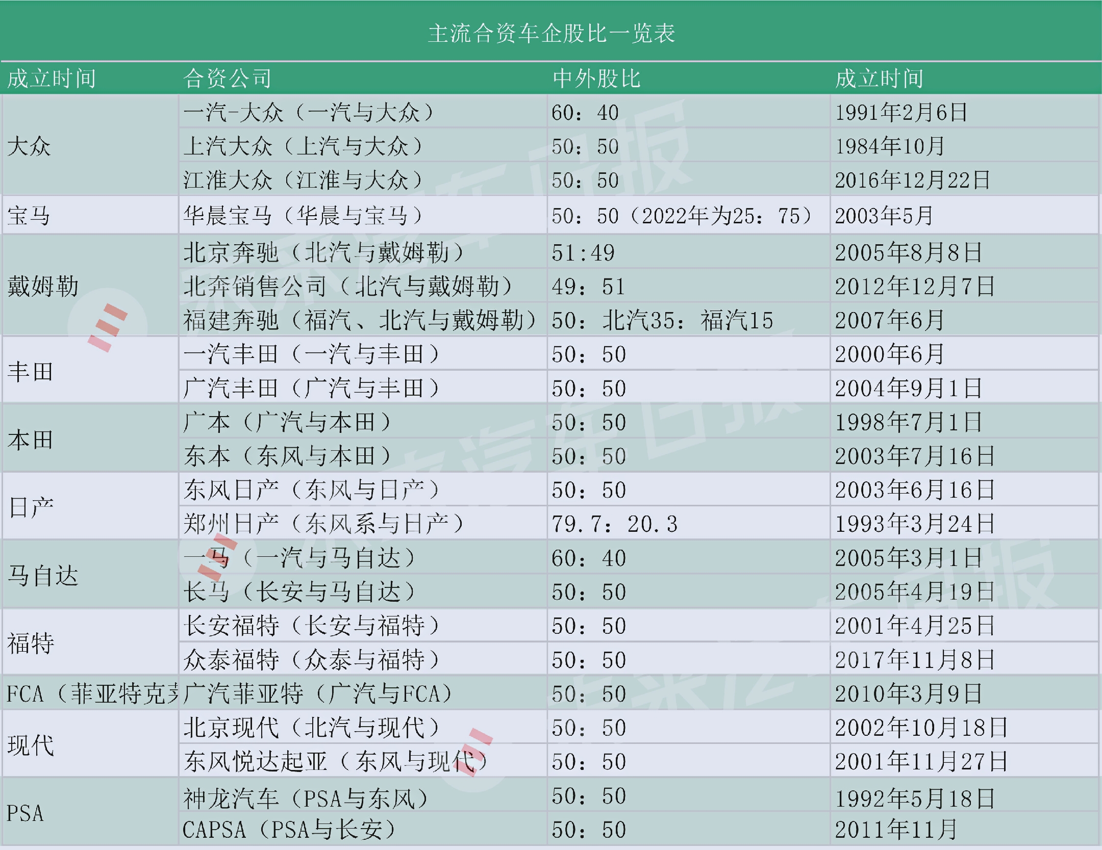 从1994年国家计划委员会(现名:国家发改委)发布《汽车工业产业政策》:汽车类中外合资企业中方股份不低于50%开始,“股比限制”在中外合资汽车公司中似乎已成“铁律”。