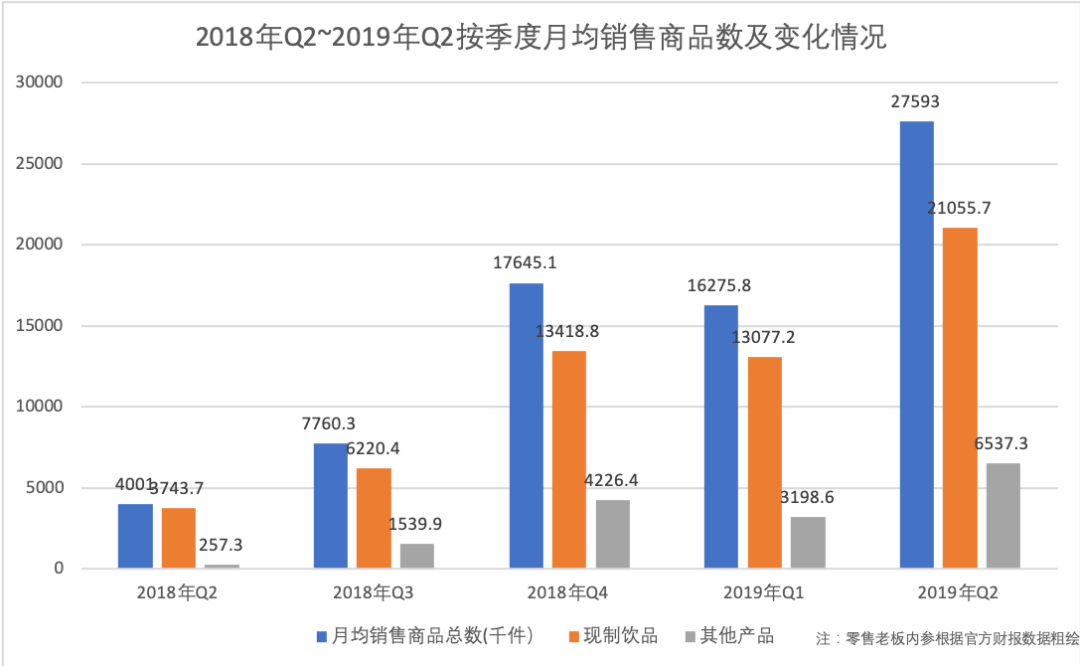 财报显示,2018年Q2~2019年Q2的五个季度,瑞幸按季度现制饮品月均销售商品数分别为374万件、622万件、1342万件、1308万件、2106万件,期间环比增速分别为66.16%、115.72%、-2.55%、61.01%;按季度其他产品月均销售商品数分别为26万件、154万件、423万件、320万件、654万件,期间环比增速分别为498.48%、174.46%、-24.32%、104.38%。
