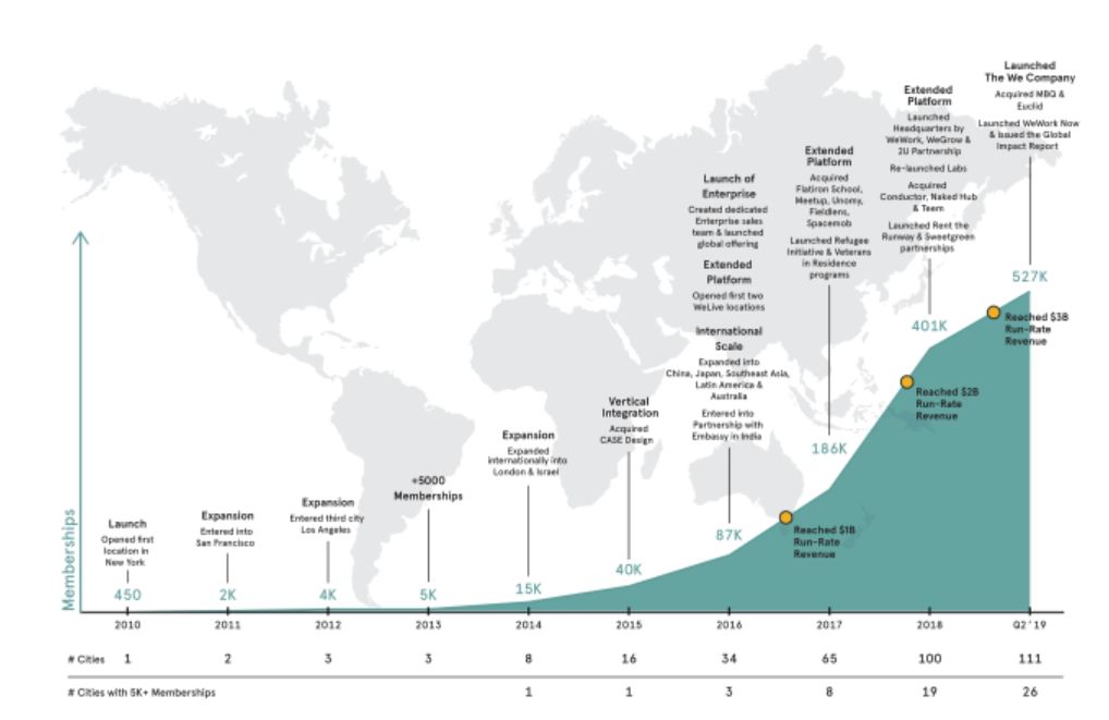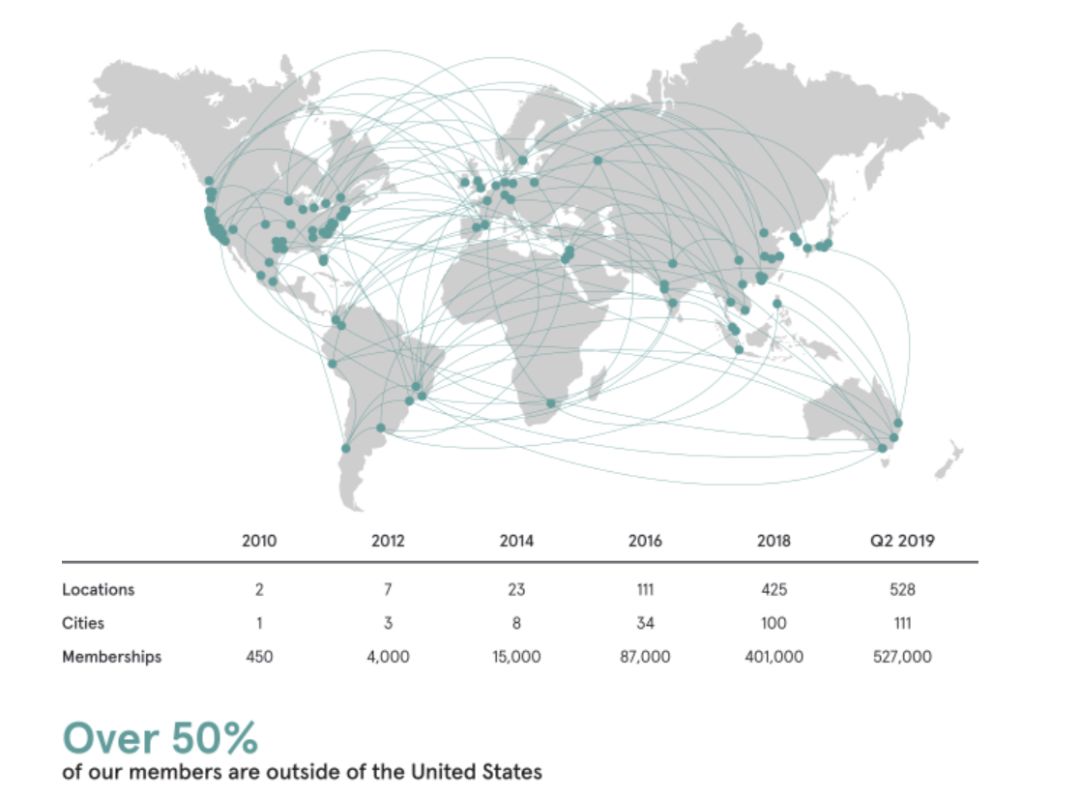 WeWork招股书显示,截至2019年6月底,WeWork拥有52.7万名会员,在全球29个国家的111个城市拥有528个分支机构。其中,52.7万名会员来自于多个行业,其中38%来自全球财富500强企业。