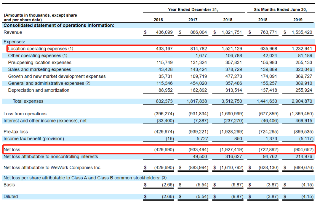 招股书显示,WeWork累计净亏损主要来自于门店扩张需要大量的资金。2016年、2017年和2018年WeWork的门店运营费用分别为4亿美元、8亿美元和15亿美元,2019年上半年,WeWork的门店运营费用高达12亿美元,而去年同期的运营费用仅为6亿美元。