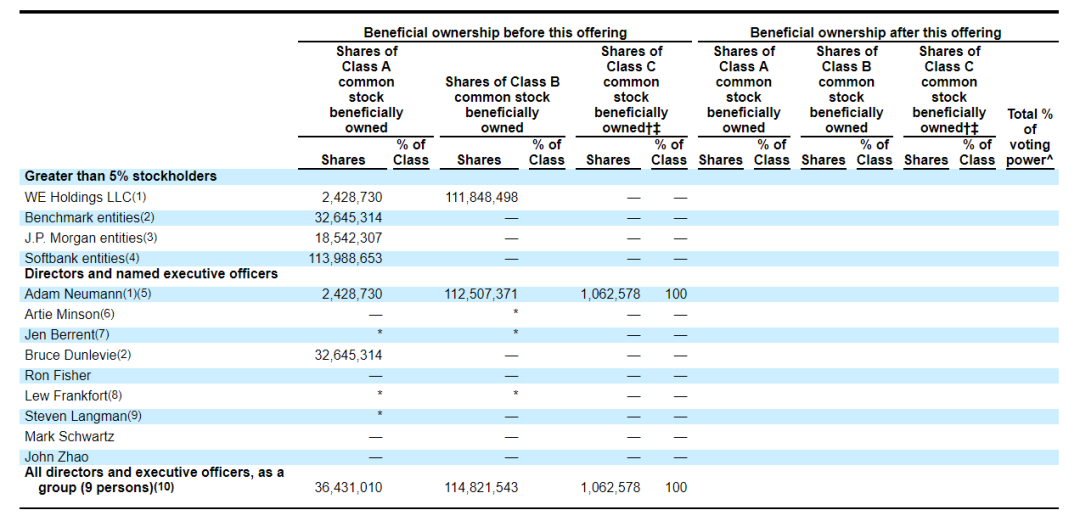 在表决权方面,WeWork的A类普通股每股有权投一票,WeWork的高投票权股票包括B类普通股和C类普通股,每股有20票。在此次发行完成后,WeWork的联合创始人兼CEO亚当·诺依曼将拥有或控制总投票权的50%以上,将控制WeWork的大部分投票股票。