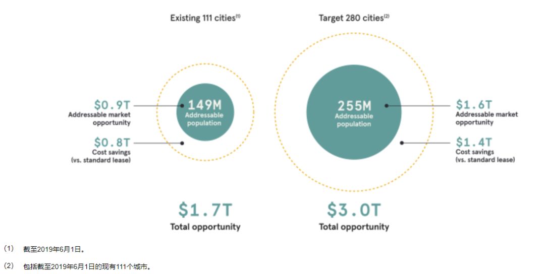 截至2019年6月30日,若将每个会员的平均收入应用于WeWork现有111个城市的1.49亿人的潜在会员人数时,WeWork的市场空间为9450亿美元。若以全球280个目标城市,2.55亿潜在会员总人数的口径来估算,WeWork的市场空间为1.6万亿美元。