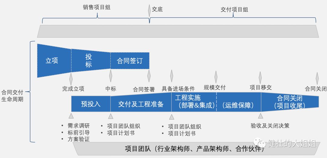 项目经理从签单前的预投入,联合销售项目组做好需求调研、标前引导和方案验证,再协调交付项目组做好交付前的准备,保障工程实施期间的规模化交付和运维,最后完成项目收尾。
