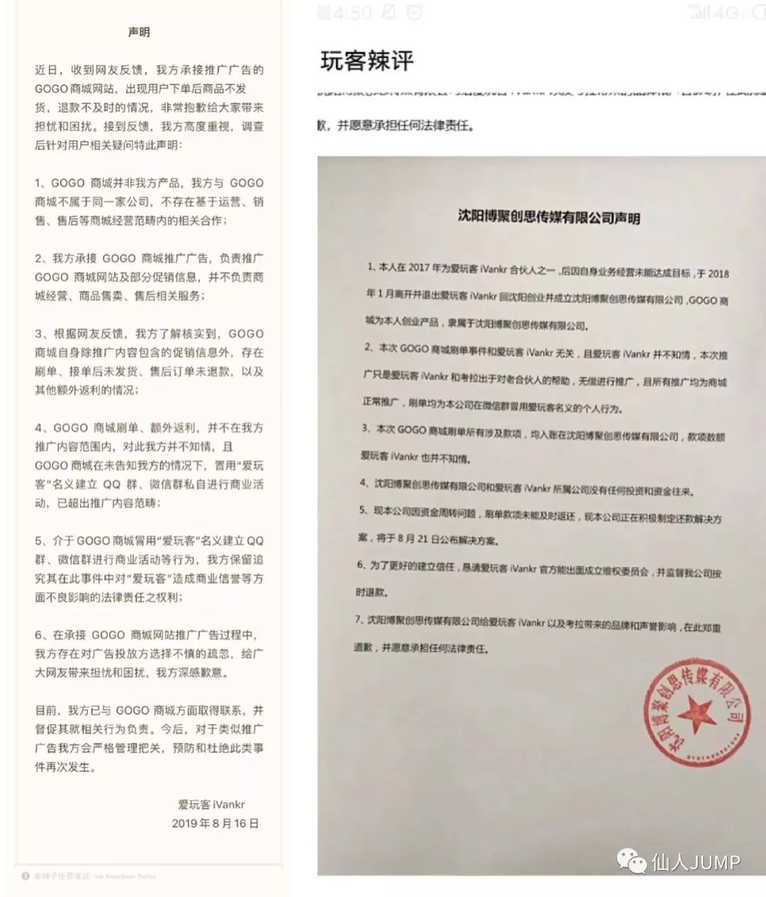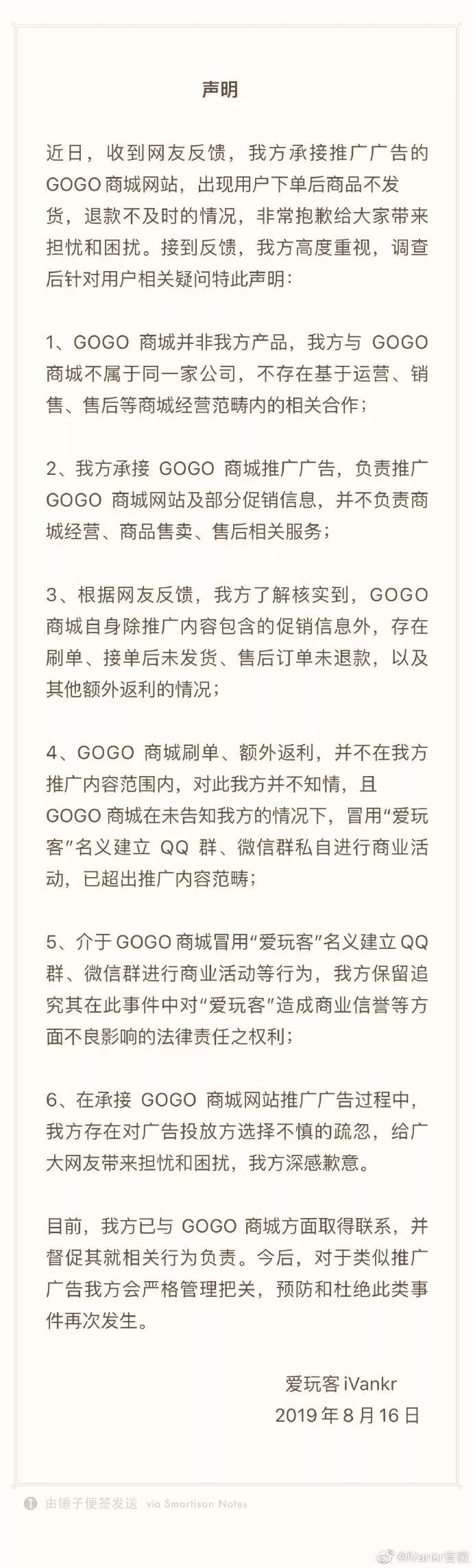 这个声明的核心含义就是,爱玩客本身对于GOGO商城的各种行为是不知情的,一切事情都是他们干的,和爱玩客没有什么关系。