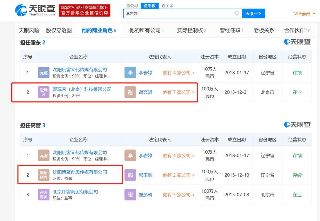 我们可以看到,【李岩婷】除了是【爱玩客(北京)科技有限公司】的股东外,还担任着一家叫做【沈阳博聚创思传媒有限公司】的监事。
