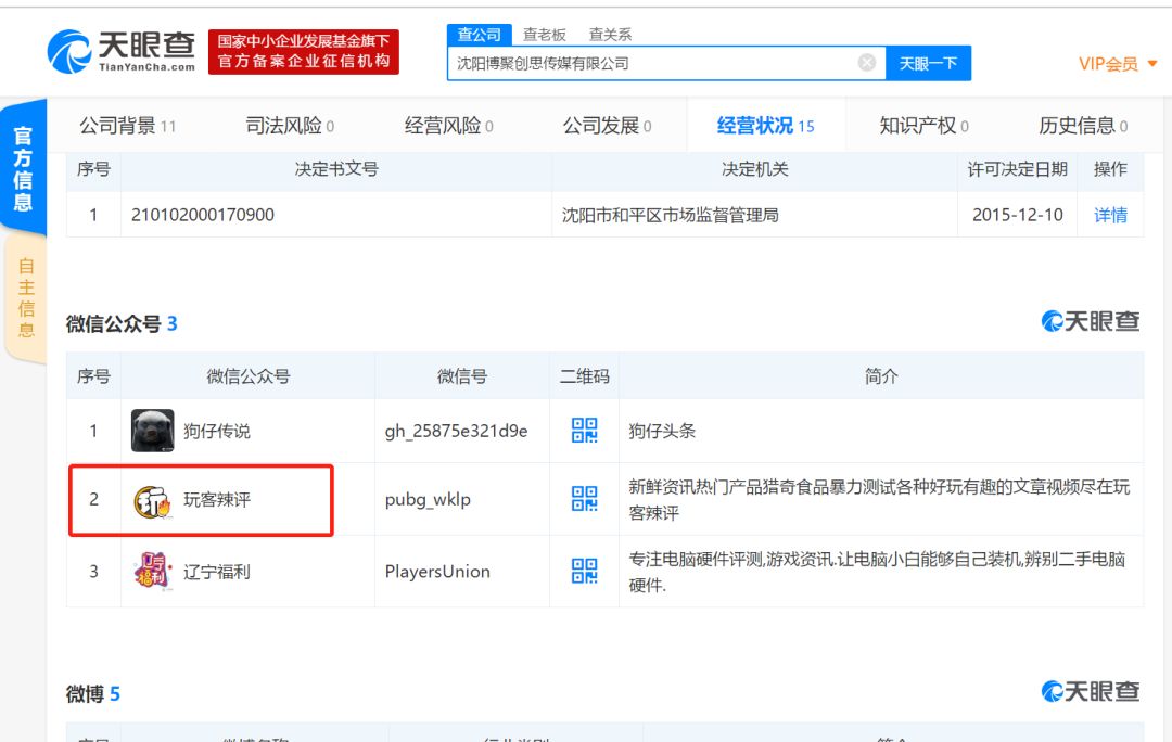 我们再进一步,看这个【沈阳博聚创思传媒有限公司】,可以看到其名下还有公众号,其中这个【玩客辣评】,引起了我的注意,因为名字里面带了【玩客】,而且B站封号的时候,也有一个玩客辣评。