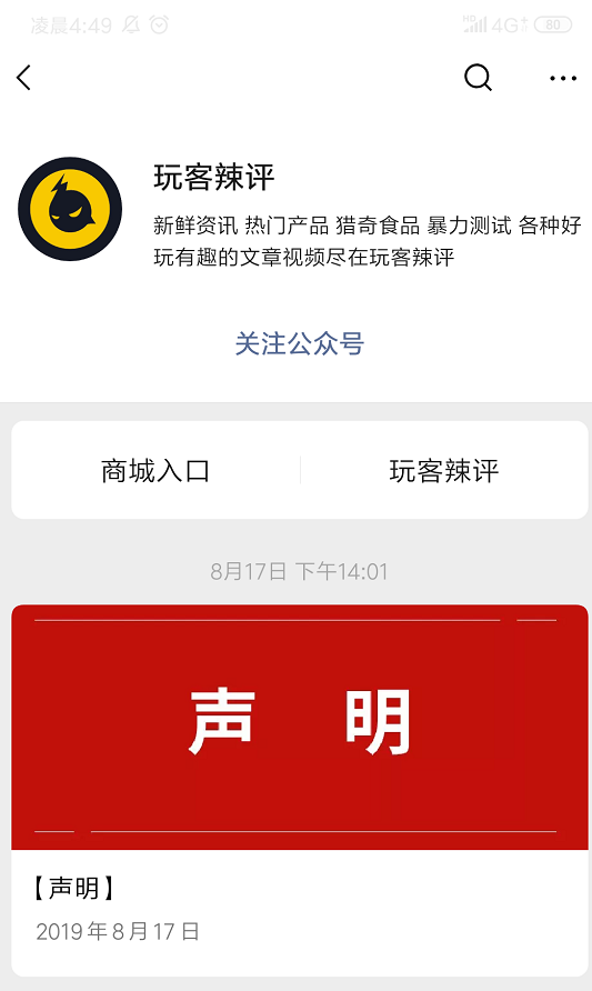 而玩客辣评公众号,发布的表示和爱玩客完全无关的声明,也是2019年8月17日。