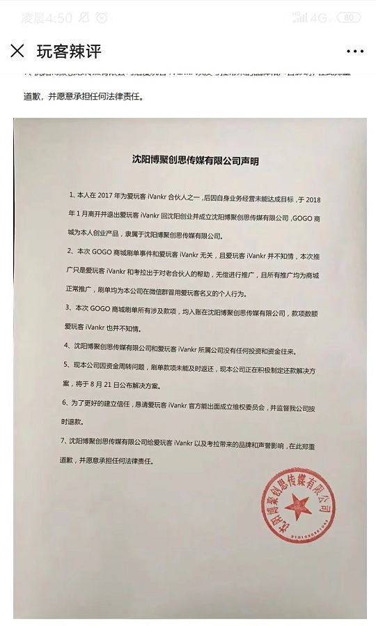 整个声明看下来,完全是撇清自己和爱玩客的关系,所有法律责任都是自己承担(这里自己是谁?声明中也没写),还公开承认自己在刷单,刷单违反《电商法》的呀老铁,看得我流下了热泪。