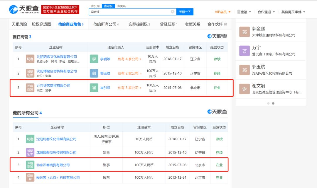 我们从李岩婷入手,可以发现她还担任过一家公司的监事,叫做【北京评客商贸】。