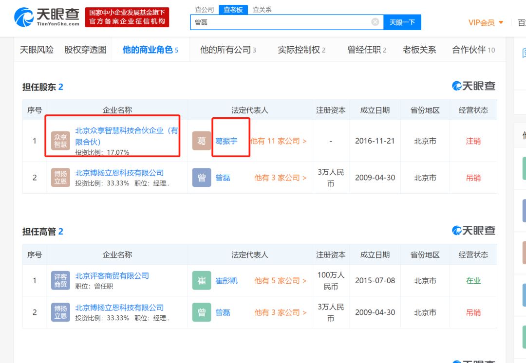 我们来查下这个曾磊的信息,可以发现他还出现在了一家叫做【众享智慧】的企业(已注销)中,企业法人叫做葛振宇(玩客互动的法人)。