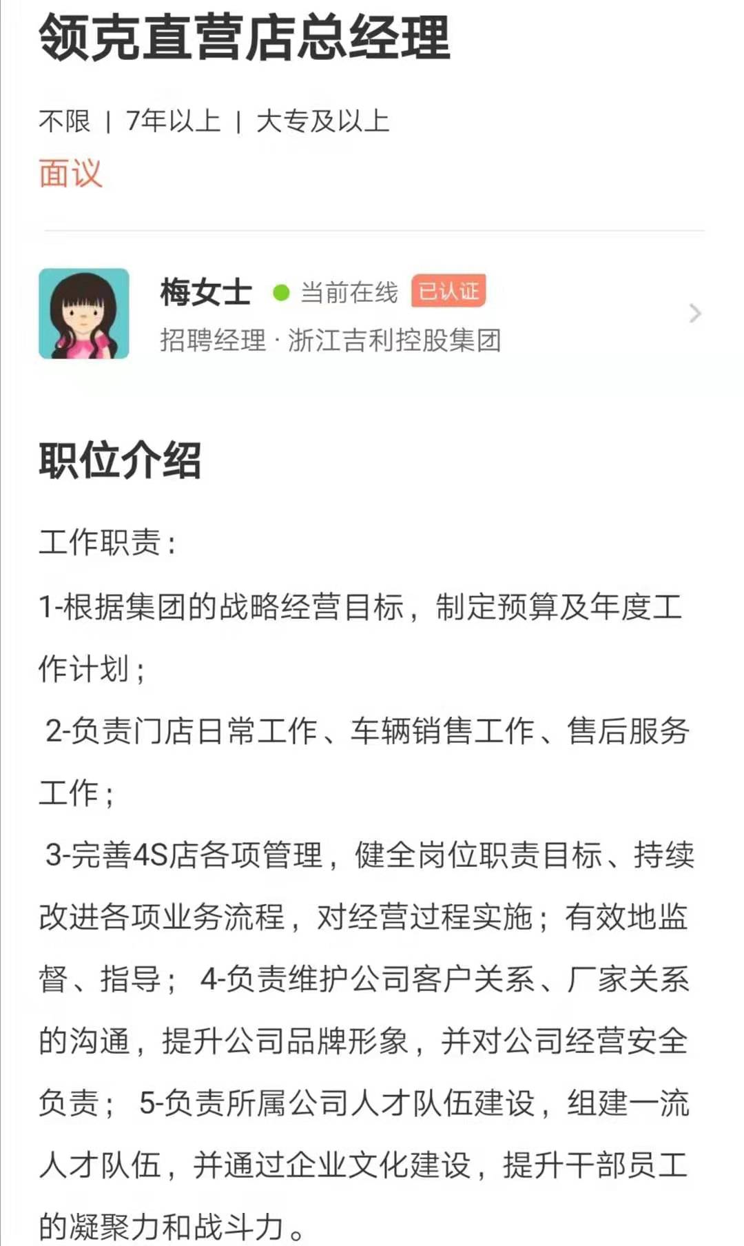 来自第三方招聘网站的信息表明,招聘职位为“领克直营店总经理”,招聘人数30人,信息发布方认证为“浙江吉利控股集团有限公司”。