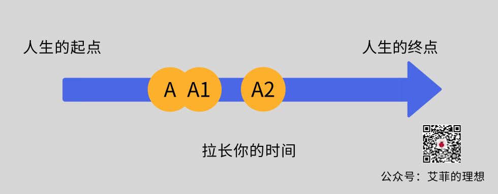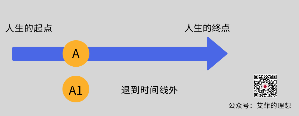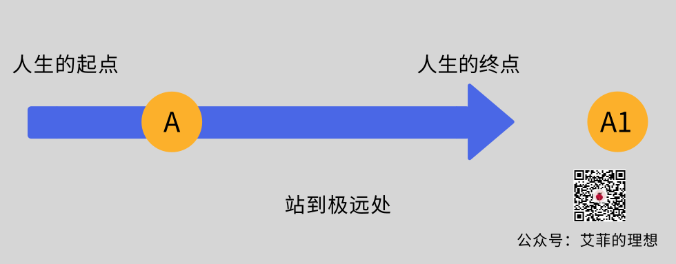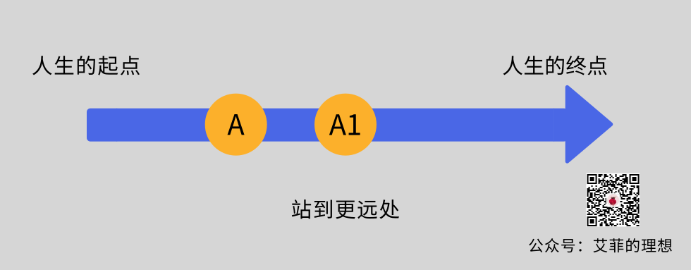 假如现在的你处在A点,困扰你的问题也发生在A点,你想做的选择也出现在A点。然后,请你站到更远一点的地方,也就是A1点(可能是5年之后,也可能是10年后),再回头审视现在的问题或现在的选择,你会有什么新的发现与感受?