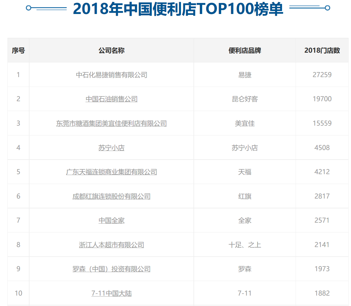 易捷是当之无愧的中国便利店之王。据中国连锁经营协会发布的2018年中国便利店TOP100榜单显示,中石化易捷在全国有27259家门店,并领先于中国石油旗下的昆仑好客19700家门店,起家于广东的美宜佳是第三名,门店数为15559家,即使第三也远远拉开了与第四名的差距。排名第四的苏宁小店为4508家。而都市人群熟悉的711和全家,仅仅分别位列第7和第10名。