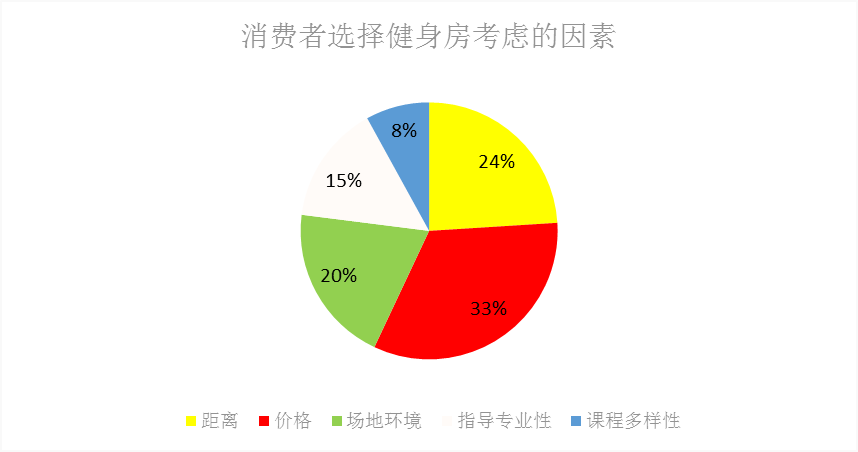 据统计:消费者在选择健身房时,价格因素占比最大,约为33%;距离因素占24%;其余因素分别是场地环境、指导专业性与课程多样性,品牌因素几乎无人考虑。健身在本质上还是一种另类的休闲娱乐方式,而行业同质化严重,消费模式趋于统一,消费者在选择健身房时,性价比与就近原则远大于其他效应。