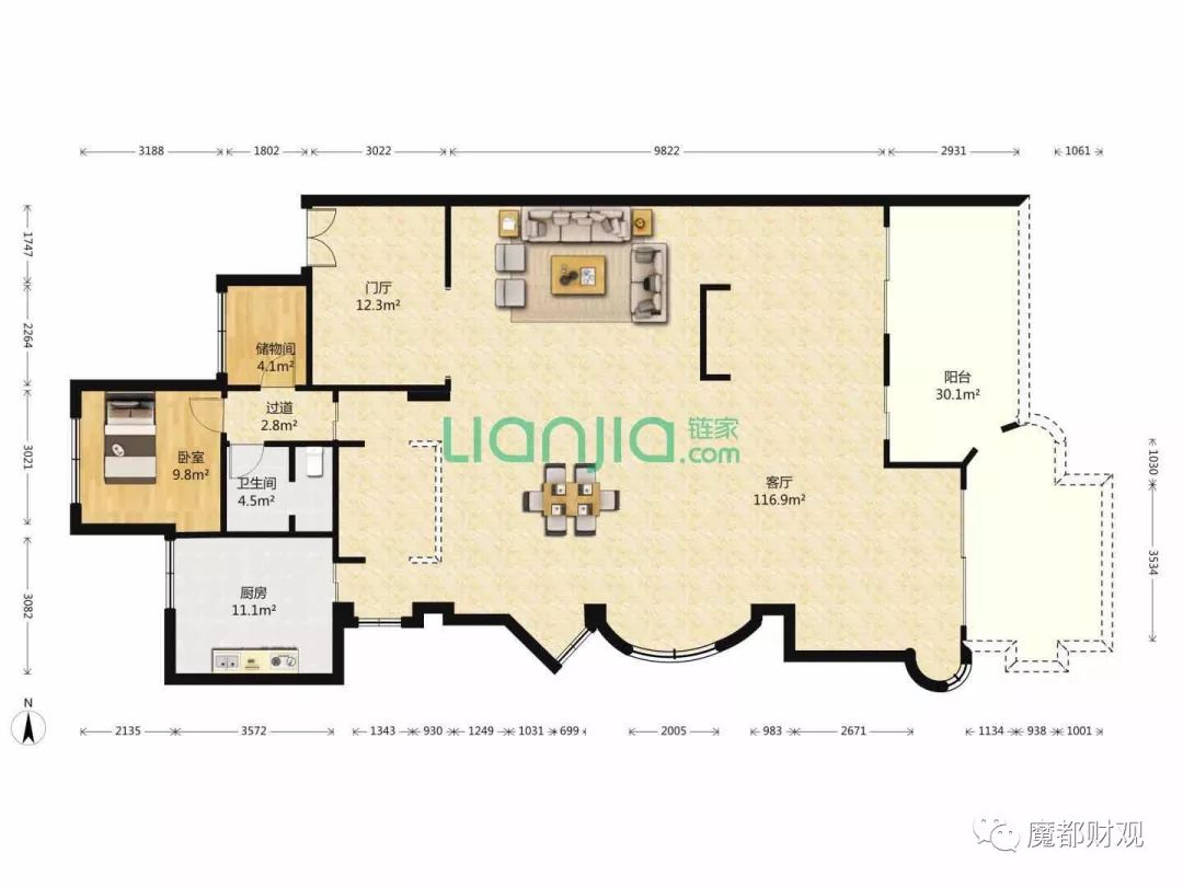 比如上海陆家嘴豪宅九庐,户型为了看江,大部分都将客厅厨房设置在北边,南边留给需要长时间采光的卧室,形成了南北向的动静分离。