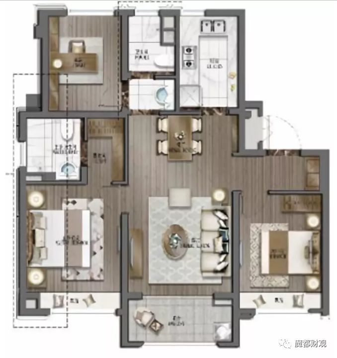 飞机户型就是房间排布在客厅两侧,一般小户型三房比较适合做成飞机户型。因为这样走廊的通道比较紧凑,利用率高。比如下图的上海泗泾的融创壹号公馆。