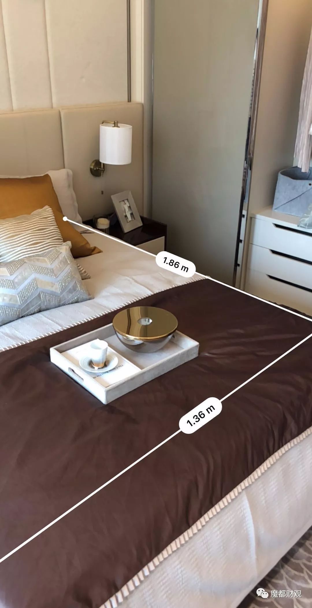 大家还要留意的是,样板房家具尺寸是否有缩放嫌疑,造成假象。这里建议大家可以用手机里自带的AR测距功能,算一下知道了。