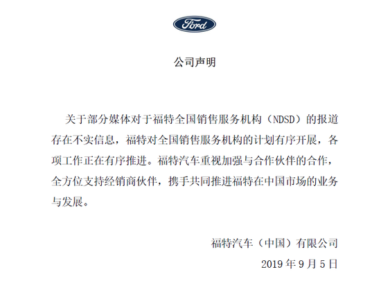 福特汽车回应“放弃整合中国销售渠道的计划”:报道存在不实消息