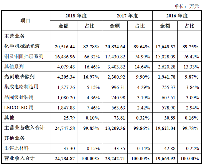 2016-2018年,公司核心技术产品化学机械抛光液与光刻胶去除剂收入占总营收比重分别为99.62%、99.54、99.75%,产品结构单一。